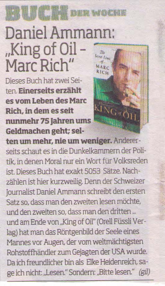 Deutsch/German “Buch der Woche” August 24, 2010 King of OilLeave a comment Die Bild am Sonntag erkürte “King of Oil” zum Buch der Woche Share this:Share Email a link to a friend (Opens in new window) Email Share on Facebook (Opens in new window) Facebook Share on X (Opens in new window) X Like Loading...
